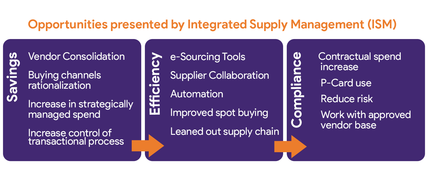 Integrated Supply Management - the ecosystem of people, process and technology which drive efficiency and effectiveness in non-core and tail end spend with suppliers.